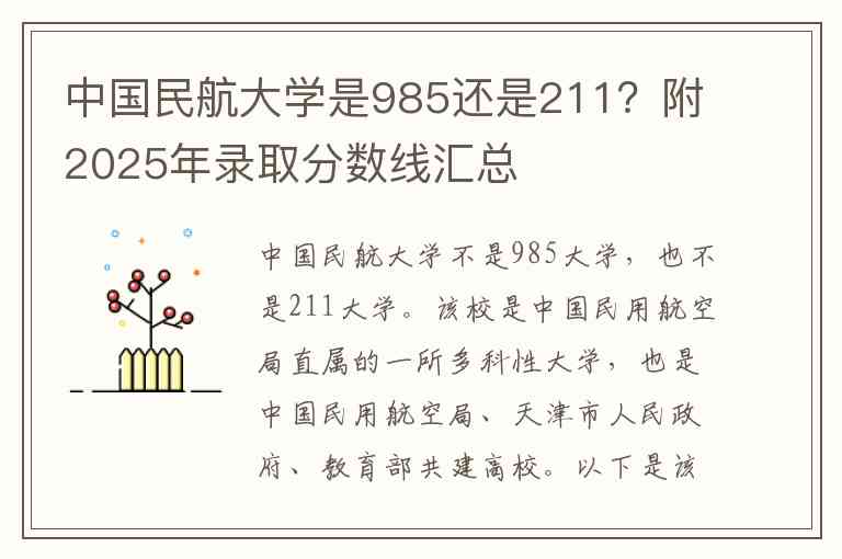 中国民航大学不是985大学,也不是211大学。该校是中国民用航空局直属的一所多科性大学,也是中国民用航空局、天津市人民政府、教育部共建高校。