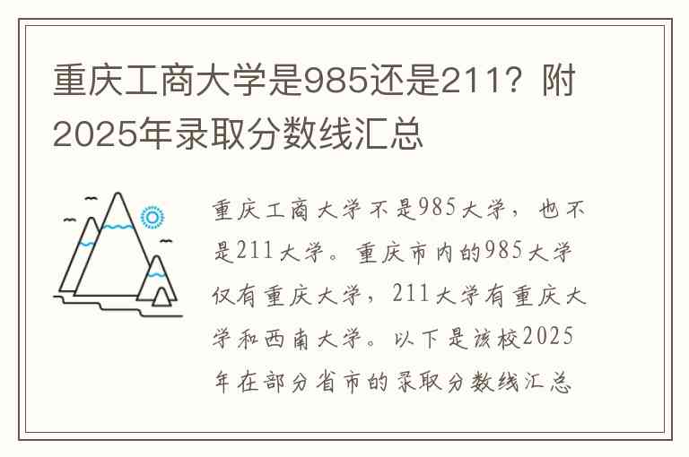 重庆工商大学不是985大学,也不是211大学。重庆市内的985大学仅有重庆大学,211大学有重庆大学和西南大学。