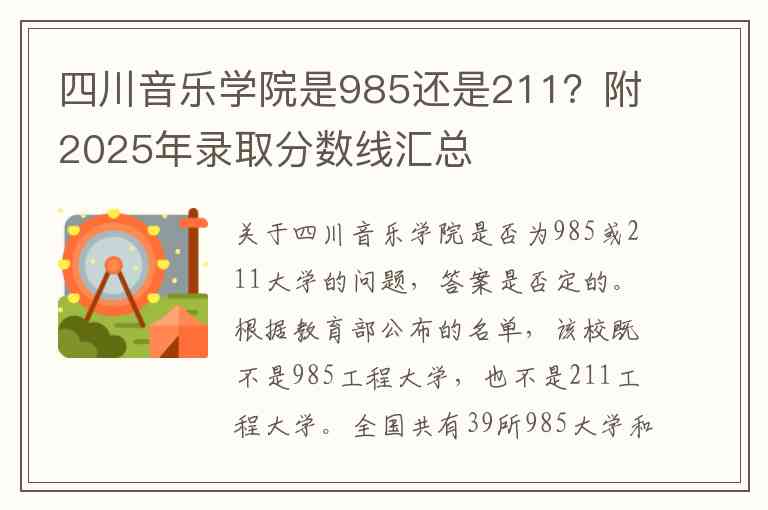 关于四川音乐学院是否为985或211大学的问题,答案是否定的。根据教育部公布的名单,该校既不是985工程大学,也不是211工程大学。全国共有39所985大学和115所211大学,其中四川省内有2所985大学(四川大学、电子科技大学)和5所211大学(四川大学、电子科技大学、西南财经大学、西南交通大学、四川农业大学)。