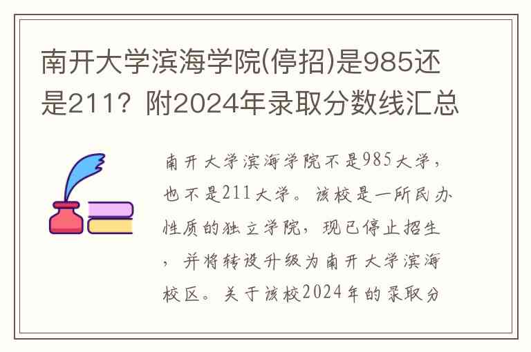 南开大学滨海学院不是985大学,也不是211大学。该校是一所民办性质的独立学院,现已停止招生,并将转设升级为南开大学滨海校区。