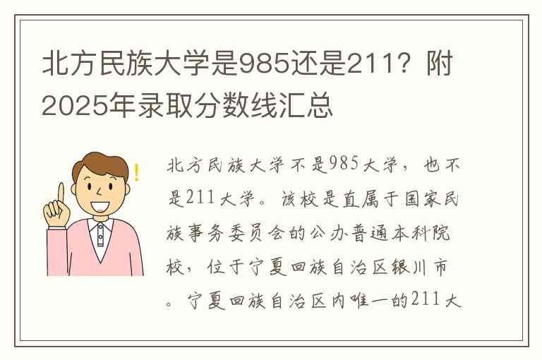北方民族大学不是985大学,也不是211大学。该校是直属于国家民族事务委员会的公办普通本科院校,位于宁夏回族自治区银川市。宁夏回族自治区内唯一的211大学是宁夏大学。