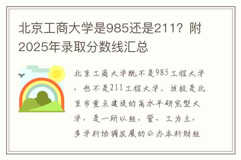 北京工商大学既不是985工程大学,也不是211工程大学。该校是北京市重点建设的高水平研究型大学,是一所以经、管、工为主,多学科协调发展的公办本科财经类院校。