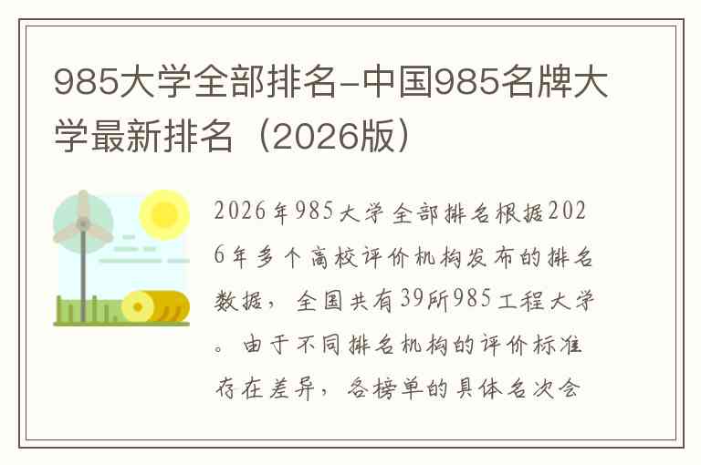 根据2026年多个高校评价机构发布的排名数据,全国共有39所985工程大学。由于不同排名机构的评价标准存在差异,各榜单的具体名次会有所不同,以下综合整理了校友会、ABC及软科等主要榜单的排名情况,供您参考。