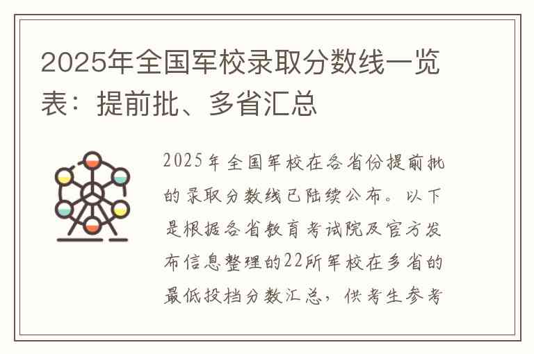 2025年全国军校在各省份提前批的录取分数线已陆续公布。以下是根据各省教育考试院及官方发布信息整理的22所军校在多省的最低投档分数汇总,供考生参考。
