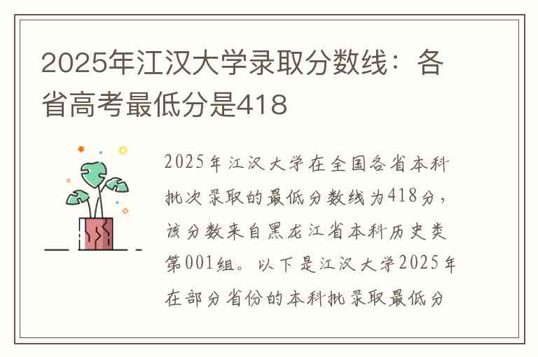 2025年江汉大学在全国各省本科批次录取的最低分数线为418分,该分数来自黑龙江省本科历史类第001组。
