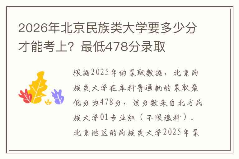 根据2025年的录取数据,北京民族类大学在本科普通批的录取最低分为478分,该分数来自北方民族大学01专业组(不限选科)。
