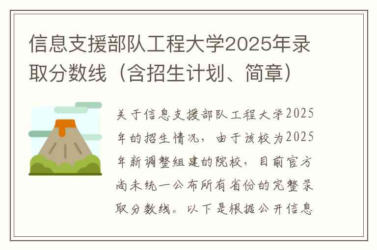 关于信息支援部队工程大学2025年的招生情况,由于该校为2025年新调整组建的院校,目前官方尚未统一公布所有省份的完整录取分数线。以下是根据公开信息整理的招生计划、部分省份录取分数线及招生简章要点,供你参考。