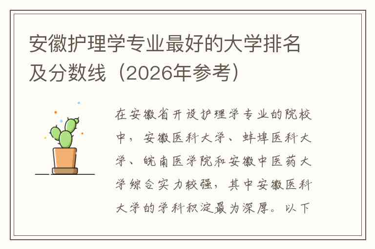 在安徽省开设护理学专业的院校中,安徽医科大学、蚌埠医科大学、皖南医学院和安徽中医药大学综合实力较强,其中安徽医科大学的学科积淀最为深厚。