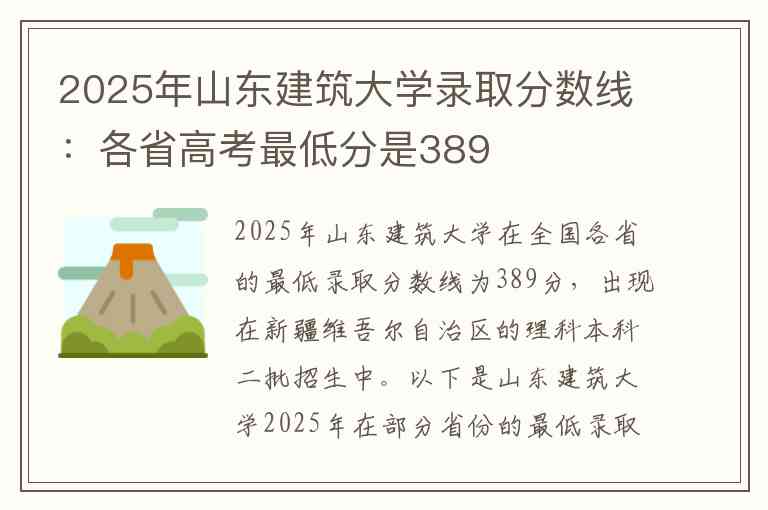2025年山东建筑大学在全国各省的最低录取分数线为389分,出现在新疆维吾尔自治区的理科本科二批招生中。