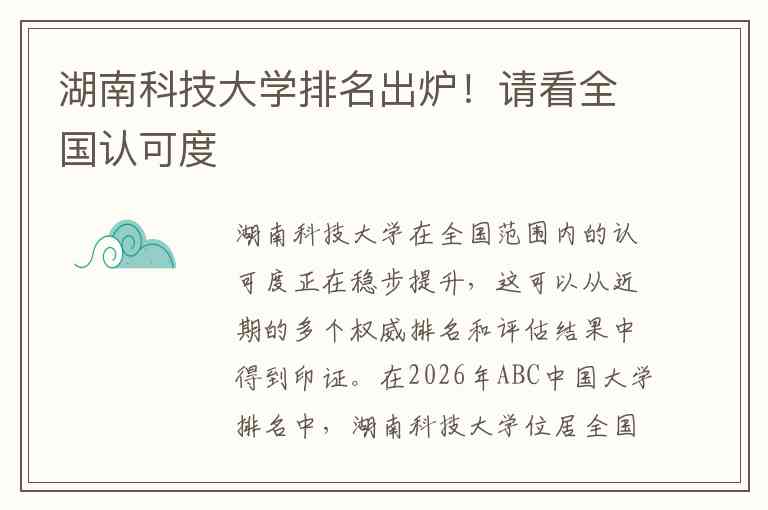 湖南科技大学在全国范围内的认可度正在稳步提升,这可以从近期的多个权威排名和评估结果中得到印证。