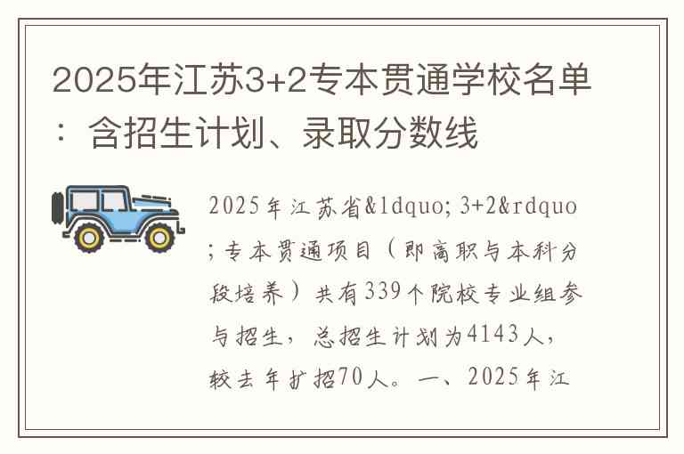 2025年江苏省“3+2”专本贯通项目(即高职与本科分段培养)共有339个院校专业组参与招生,总招生计划为4143人,较去年扩招70人。