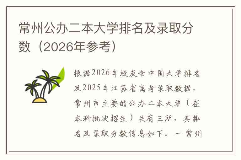 根据2026年校友会中国大学排名及2025年江苏省高考录取数据,常州市主要的公办二本大学(在本科批次招生)共有三所,其排名及录取分数信息如下。
