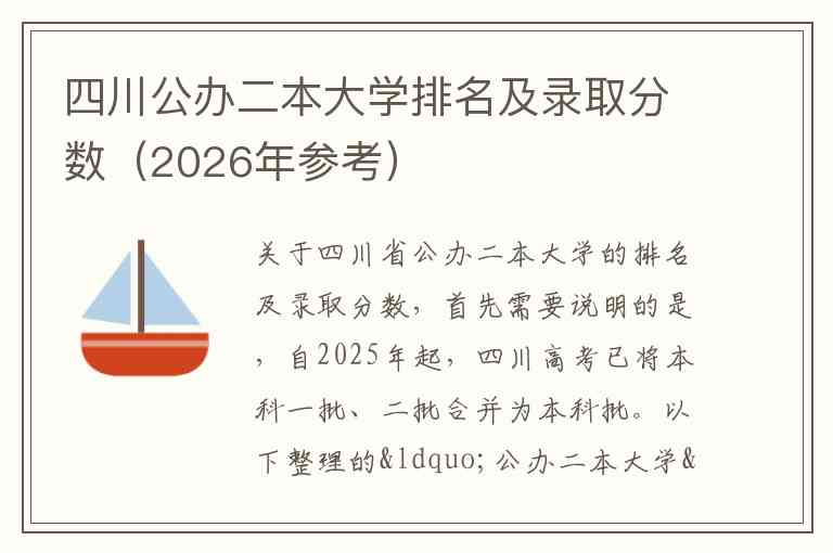 关于四川省公办二本大学的排名及录取分数,首先需要说明的是,自2025年起,四川高考已将本科一批、二批合并为本科批。以下整理的“公办二本大学”主要指在本科批录取中,录取分数通常位于特殊类型招生控制线(特控线)附近及以下的非双一流公办本科院校。2025年四川高考的批次线为:历史类本科线467分、特控线533分;物理类本科线438分、特控线518分。