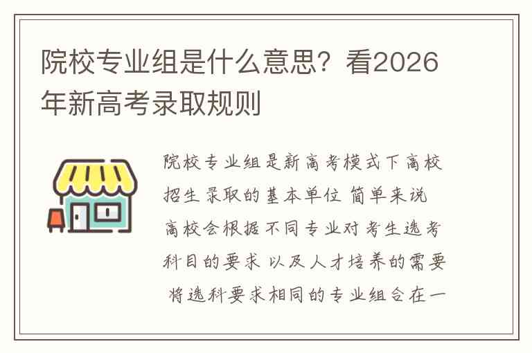 院校专业组是新高考模式下高校招生录取的基本单位 简单来说 高校会根据不同专业对考生选考科目的要求 以及人才培养的需要 将选科要求相同的专业组合在一起 形成一个专业组 一所高校可以设置一个或多个这样的专业组 每个组内包含数量不等的具体专业
