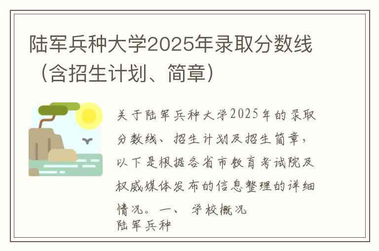 关于陆军兵种大学2025年的录取分数线、招生计划及招生简章,以下是根据各省市教育考试院及权威媒体发布的信息整理的详细情况。
