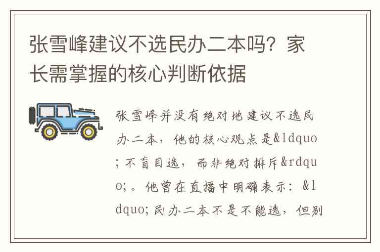 张雪峰并没有绝对地建议不选民办二本,他的核心观点是“不盲目选,而非绝对排斥”。他曾在直播中明确表示:“民办二本不是不能选,但别为了‘本科’头衔让家庭背重债,也别选没特色的‘凑数’专业”。对于家长而言,是否选择民办二本,需要掌握以下四个维度的核心判断依据,结合家庭实际情况做出理性决策。