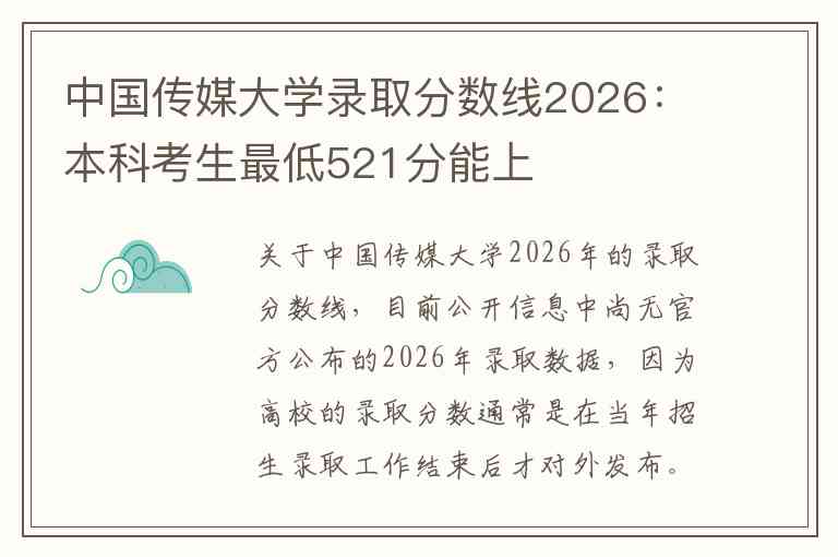 关于中国传媒大学2026年的录取分数线,目前公开信息中尚无官方公布的2026年录取数据,因为高校的录取分数通常是在当年招生录取工作结束后才对外发布。