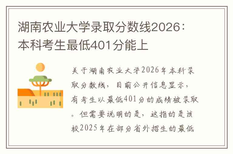 关于湖南农业大学2026年本科录取分数线,目前公开信息显示,有考生以最低401分的成绩被录取。但需要说明的是,这指的是该校2025年在部分省外招生的最低分数,而非2026年的实际录取线。