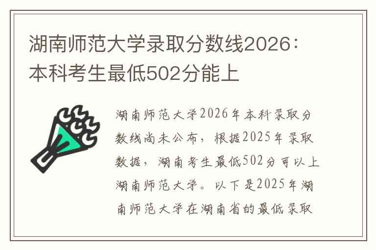 湖南师范大学2026年本科录取分数线尚未公布,根据2025年录取数据,湖南考生最低502分可以上湖南师范大学。