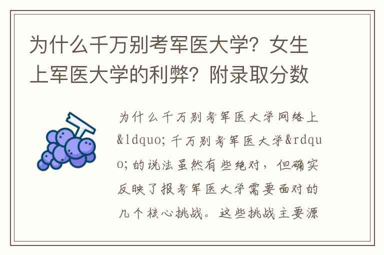 网络上“千万别考军医大学”的说法虽然有些绝对,但确实反映了报考军医大学需要面对的几个核心挑战。这些挑战主要源于其“军”与“医”双重身份带来的严格约束和特殊要求。