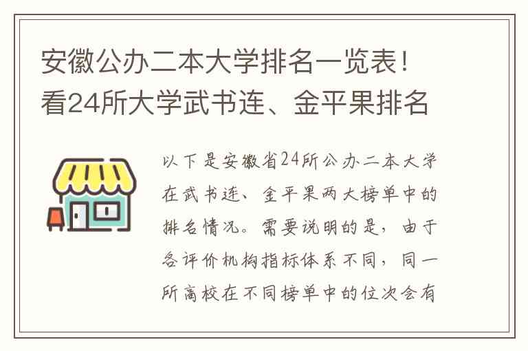 以下是安徽省24所公办二本大学在武书连、金平果两大榜单中的排名情况。需要说明的是,由于各评价机构指标体系不同,同一所高校在不同榜单中的位次会有所差异,以下列表综合了搜索结果中可获取的最新数据。
