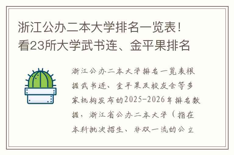 根据武书连、金平果及校友会等多家机构发布的2025-2026年排名数据,浙江省公办二本大学(指在本科批次招生、非双一流的公立院校)的综合实力排名情况如下。需要注意的是,由于各机构评价标准不同,同一所学校的排名会有所差异,下表综合整理了23所主要公办院校的排名情况。