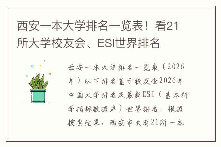 以下排名基于校友会2026年中国大学排名及最新ESI(基本科学指标数据库)世界排名。根据搜索结果,西安市共有21所一本大学(含军事类院校),具体排名情况如下:
