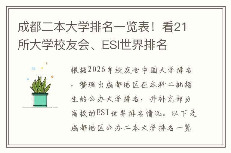 根据2026年校友会中国大学排名,整理出成都地区在本科二批招生的公办大学排名,并补充部分高校的ESI世界排名情况。