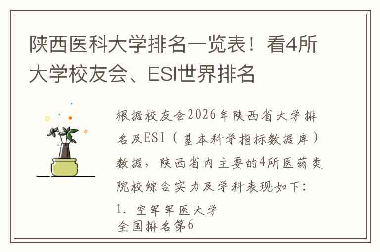 根据校友会2026年陕西省大学排名及ESI(基本科学指标数据库)数据,陕西省内主要的4所医药类院校综合实力及学科表现如下: