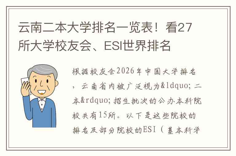 根据校友会2026年中国大学排名,云南省内被广泛视为“二本”招生批次的公办本科院校共有15所。以下是这些院校的排名及部分院校的ESI(基本科学指标数据库)世界学科排名情况。