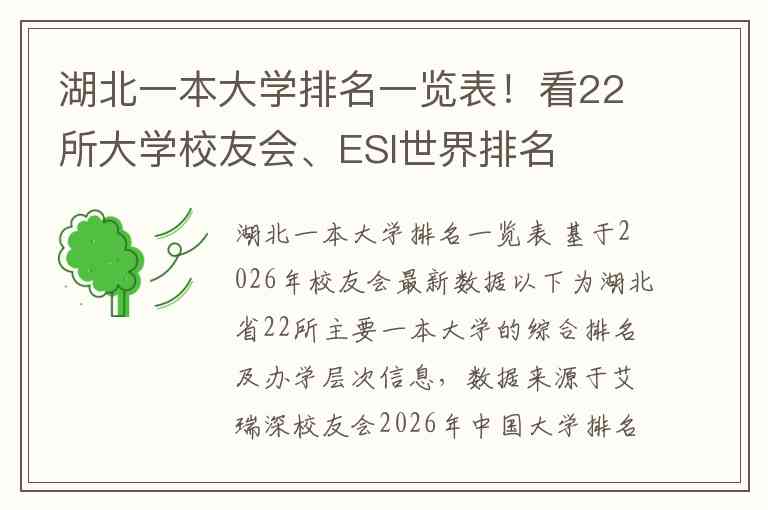 以下为湖北省22所主要一本大学的综合排名及办学层次信息,数据来源于艾瑞深校友会2026年中国大学排名。