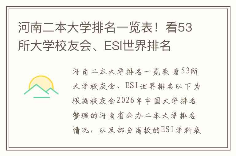 以下为根据校友会2026年中国大学排名整理的河南省公办二本大学排名情况,以及部分高校的ESI学科表现。