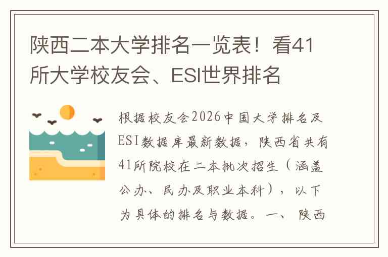 根据校友会2026中国大学排名及ESI数据库最新数据,陕西省共有41所院校在二本批次招生(涵盖公办、民办及职业本科),以下为具体的排名与数据。