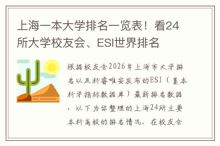 根据校友会2026年上海市大学排名以及科睿唯安发布的ESI(基本科学指标数据库)最新排名数据,以下为你整理的上海24所主要本科高校的排名情况。