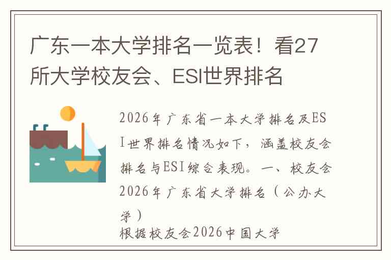 2026年广东省一本大学排名及ESI世界排名情况如下,涵盖校友会排名与ESI综合表现。
