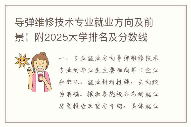 根据2025年软科中国高职院校专业排名的相关数据,目前开设导弹维修技术专业的高校中,排名情况如下: