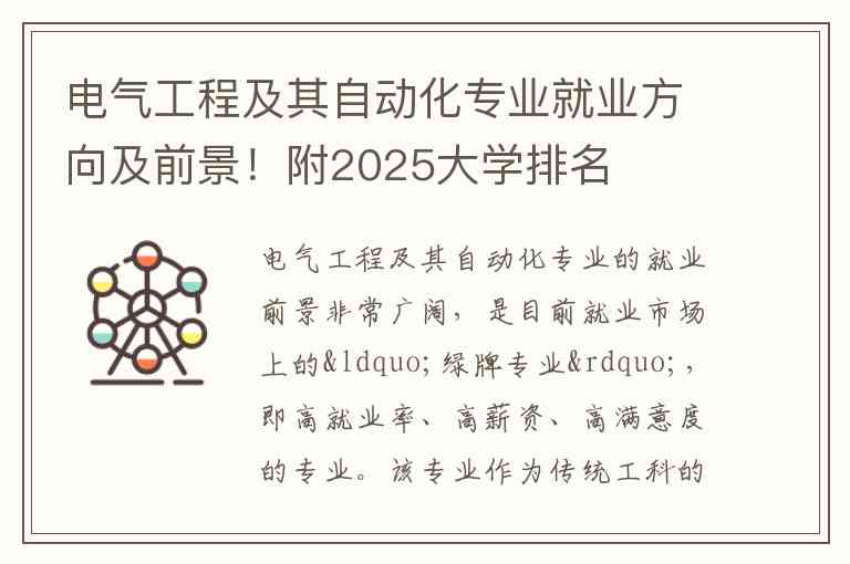 就业质量高:电气工程及其自动化专业是2025年的“绿牌专业”,近五年已上榜四次,就业市场表现强劲。该专业的工作与专业相关度达到86%,就业满意度为85%,均位居本科主要专业前列。