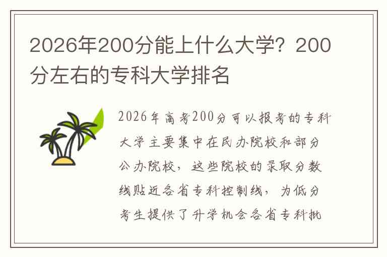 2026年高考200分可以报考的专科大学主要集中在民办院校和部分公办院校,这些院校的录取分数线贴近各省专科控制线,为低分考生提供了升学机会