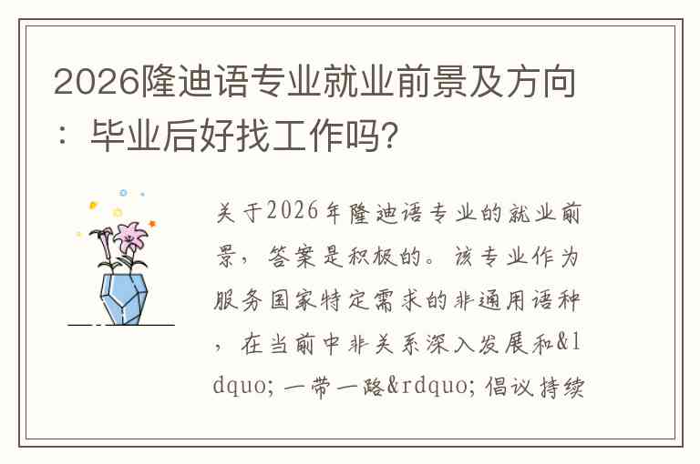 关于2026年隆迪语专业的就业前景,答案是积极的。该专业作为服务国家特定需求的非通用语种,在当前中非关系深入发展和“一带一路”倡议持续推进的背景下,具有较为广阔的市场需求和明确的就业方向。