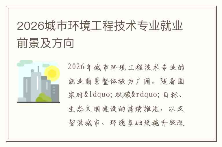 2026年城市环境工程技术专业的就业前景整体较为广阔。随着国家对“双碳”目标、生态文明建设的持续推进,以及智慧城市、环境基础设施升级改造需求的增加,该专业毕业生在就业市场上保持着较高的竞争力。