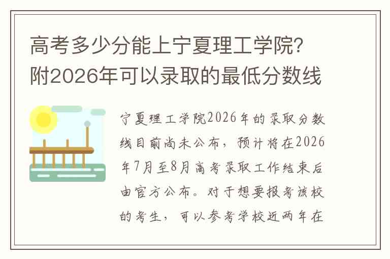 宁夏理工学院2026年的录取分数线目前尚未公布,预计将在2026年7月至8月高考录取工作结束后由官方公布。对于想要报考该校的考生,可以参考学校近两年在各省的录取数据来评估自己的录取概率。