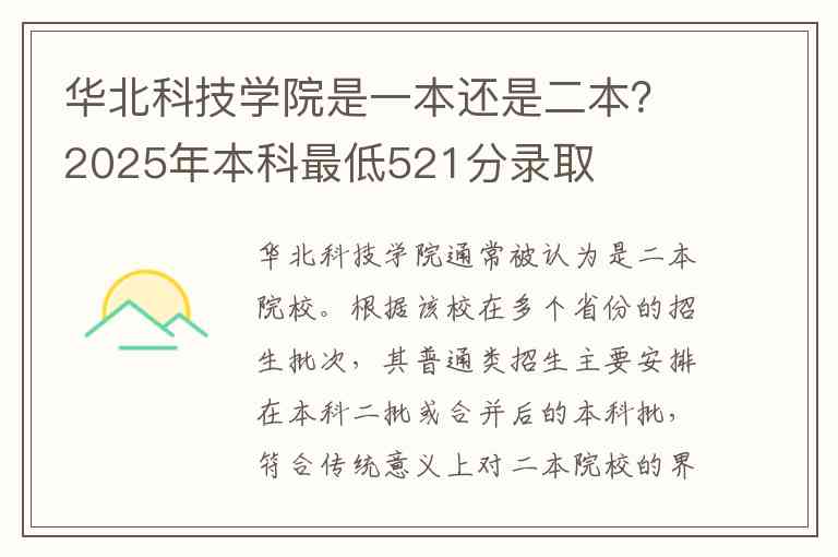 华北科技学院通常被认为是二本院校。根据该校在多个省份的招生批次,其普通类招生主要安排在本科二批或合并后的本科批,符合传统意义上对二本院校的界定。该校2025年在河北省本科批物理类的最低录取分数为521分,对应专业为土木工程。