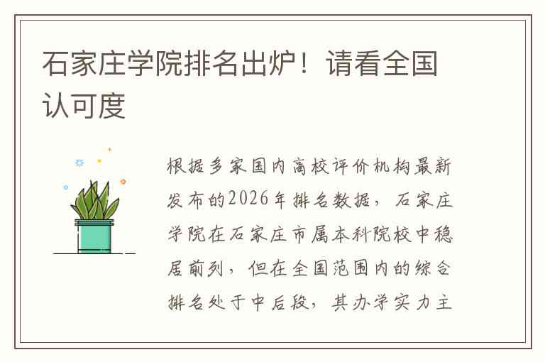 根据多家国内高校评价机构最新发布的2026年排名数据,石家庄学院在石家庄市属本科院校中稳居前列,但在全国范围内的综合排名处于中后段,其办学实力主要体现在应用型人才培养和特色专业建设上。