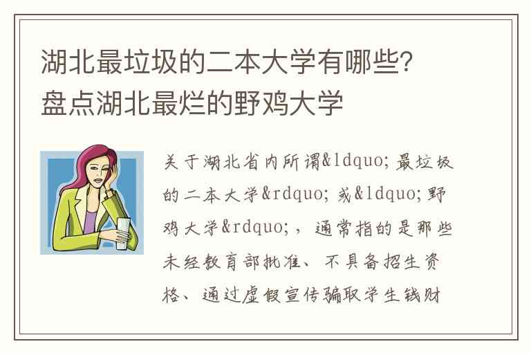 关于湖北省内所谓“最垃圾的二本大学”或“野鸡大学”,通常指的是那些未经教育部批准、不具备招生资格、通过虚假宣传骗取学生钱财的虚假大学(也称“学历工厂”或“野鸡大学”)。这类学校的毕业证书不被国家承认,学生一旦误入,不仅会浪费时间和金钱,还会错失接受正规教育的机会。