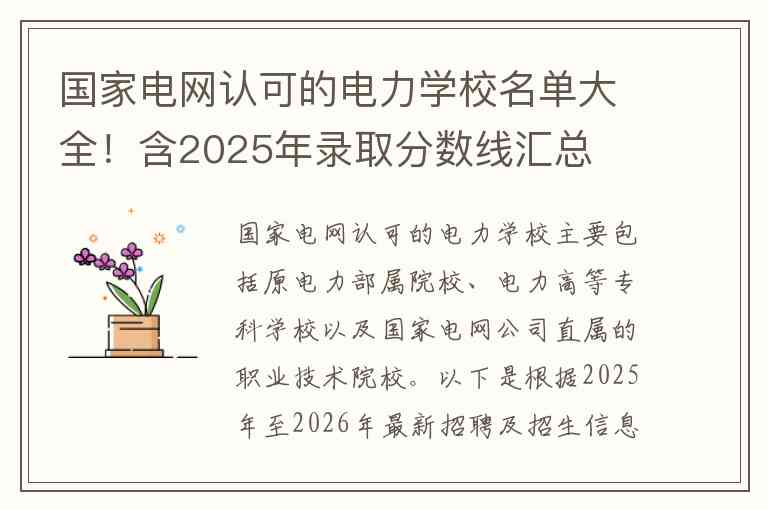 国家电网认可的电力学校主要包括原电力部属院校、电力高等专科学校以及国家电网公司直属的职业技术院校。以下是根据2025年至2026年最新招聘及招生信息整理的学校名单及录取分数线情况。