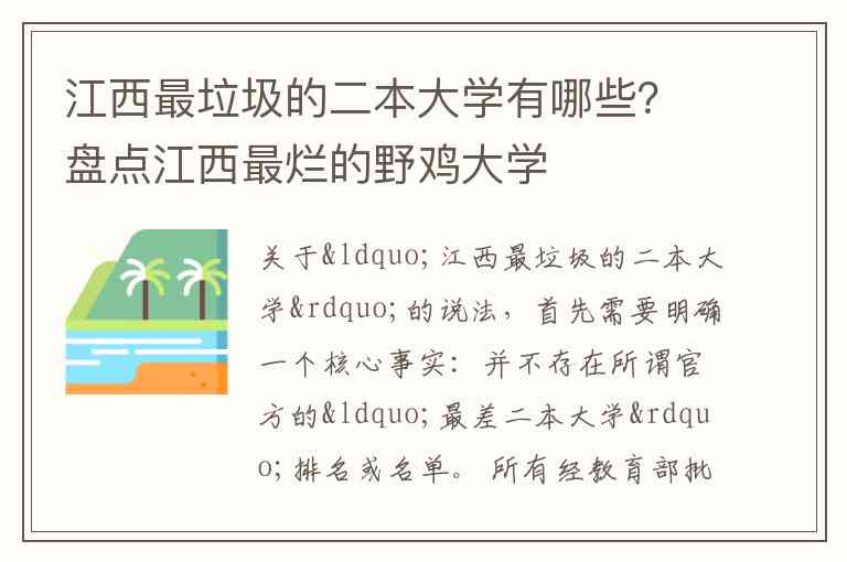 关于“江西最垃圾的二本大学”的说法,首先需要明确一个核心事实:并不存在所谓官方的“最差二本大学”排名或名单。 所有经教育部批准设立的正规本科院校,都有其合法的办学资质和存在的意义,简单地用“垃圾”来定义是不准确也不负责任的。
