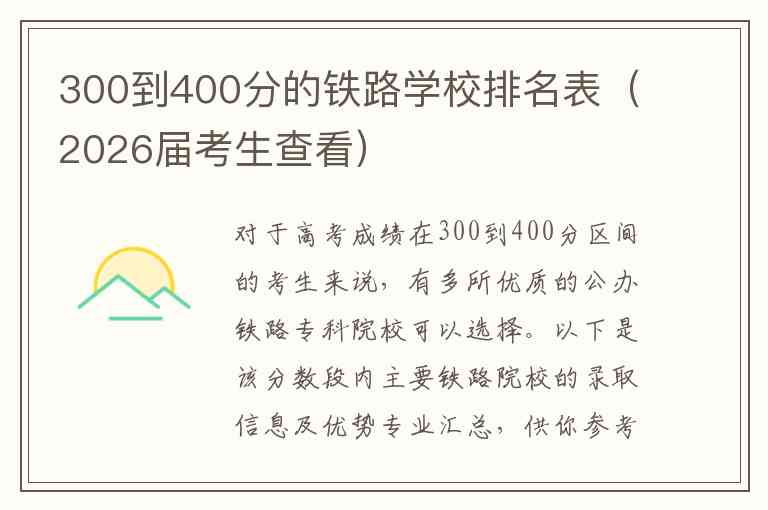 对于高考成绩在300到400分区间的考生来说,有多所优质的公办铁路专科院校可以选择。以下是该分数段内主要铁路院校的录取信息及优势专业汇总,供你参考。