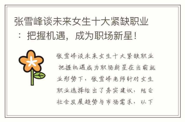 在当前就业形势下,张雪峰老师针对女生职业选择给出了务实建议,结合社会发展趋势与市场需求,以下十大紧缺职业值得重点关注