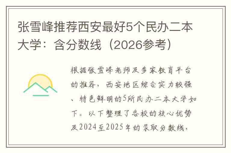 根据张雪峰老师及多家教育平台的推荐,西安地区综合实力较强、特色鲜明的5所民办二本大学如下。以下整理了各校的核心优势及2024至2025年的录取分数线,供2026届考生参考。