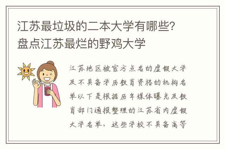 以下是根据历年媒体曝光及教育部门通报整理的江苏省内虚假大学名单,这些学校不具备高等学历教育招生资格,所发放的毕业证书国家不予承认,请考生和家长务必警惕:
